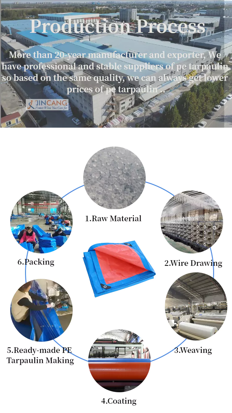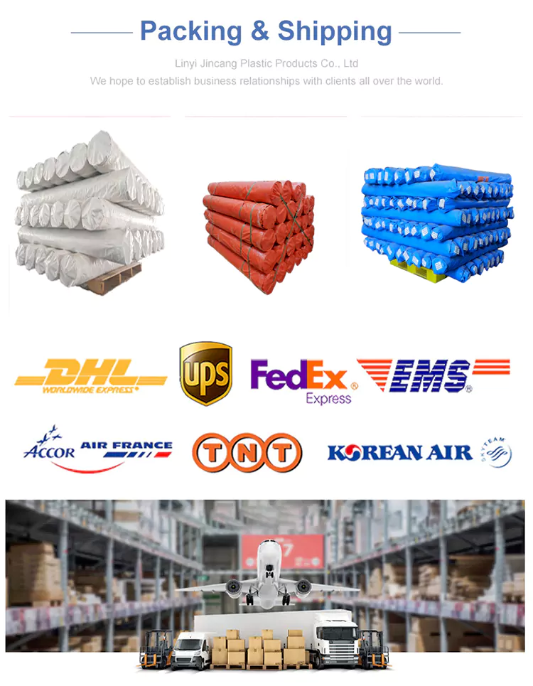 Јинцанг је један од професионалних произвођача ПЕ церадних рола у Кини, 90 ГСМ трака ПЕ церадне ролне се пакује по ролну. Ширина је обично 1,83 м, 2 м, 4 м, 5 м, 6 м. Дужина је обично 63 м, 91 м, 100 м 200 м итд. И такође можемо прилагодити према вашим захтевима. Широко се користи за заштиту на отвореном, покривајући робу, градилишта, пољопривредне сврхе и привремена склоништа.