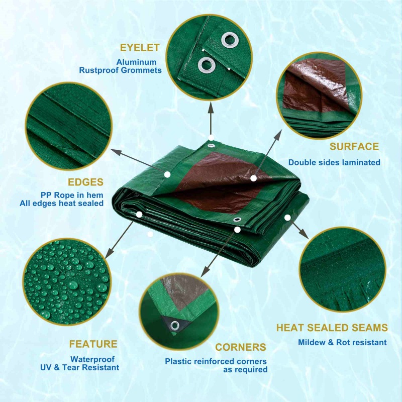 јесте мале тежине, отпорне на хабање, отпорне на кишу и старење. Његова снага и заптивна својства су побољшана ткањем и двостраним премазом. јесте широко се користи за покривање терета, контролу прашине на градилиштима, на отвореном складиште, и привремена изградња шатора.